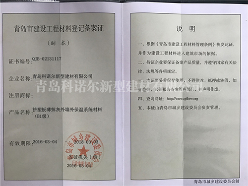 青島科諾爾新型建材有限公司主要產(chǎn)品:擠塑板( 阻燃B1級.B2級),泡沫板( 阻燃B1級.B2級)及各種造型,聚合物砂漿系列(粘結砂漿.罩面砂漿.膠粉.瓷磚粘接劑.填縫劑.界面劑),各種新型建材、保溫材料等等,公司產(chǎn)品遍銷全國各地,受到廣大用戶的一致好評。